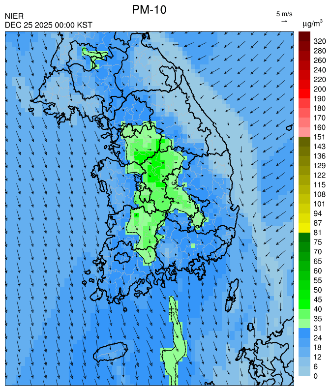 ○ 중서부 지역을 시작으로 오전부터 '보통' 수준의 국외 미세먼지가 유입되어 남동진하면서 대부분 지역의 미세먼지 농도는 일평균 '보통' 으로 예상됩니다. 또한, 일부 중서부 지역은 밤에 기류 수렴으로 유입된 국외 미세먼지가 축적되어 농도가 상승할 것으로 예상됩니다.